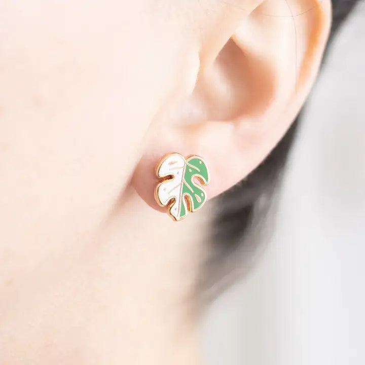 Monstera Albo earrings capture the plant's coveted variegation in a playful mismatched pair—one leaf lush green, the other half white. Perfect for showing off your unique style, just like each unique leaf of the Monstera Albo itself!